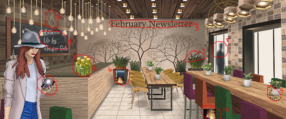 Well, unfortunately, no one won last month’s, Scavenger Hunt. If you’re interested, here are the ten items needed to win. 1. Harper is holding a copy of Between Us. 2. There are bottles of Snake Oil on the counter. 3. There’s a lasso amongst the hanging bulbs. 4. Between Us is on the menu of the day. 5. The title of the newsletter is on the wall. 6. The first cover of Snake Oil is on the face of the planter. 7. There is a stethoscope in the plant. 8. The shadow outside of the café is the same figure on the front cover of Between Us. 9. There is a snake on the table. 10. A small version of Suffering and Wisdom, which is the gift for subscribing to the newsletter, is on the floor under the orange chair. I hope you had fun hunting down those clues. If you missed out on this contest, don’t worry, we’ll have more challenges and giveaways in the coming months!
