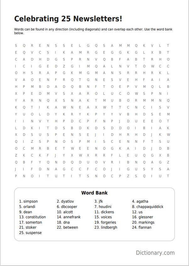 To help celebrate our milestone, I made a Word Search puzzle highlighting the newsletter topics that captured our interests over the last few years.